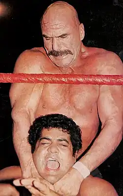 Graham (top) wrestling Pedro Morales (bottom), circa 1983