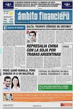 Ámbito Financiero is an Argentine newspaper founded on December 9, 1976, by economist Julio A. Ramos. It is one of the main economic newspapers. It was initially sold in Downtown Buenos Aires, covering mainly the daily prices of the U.S. dollar, gold, stocks, etc., and included other editorials.