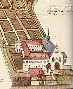 The 17th century Aegidienkirche and the Capuchin monastery in 1628.