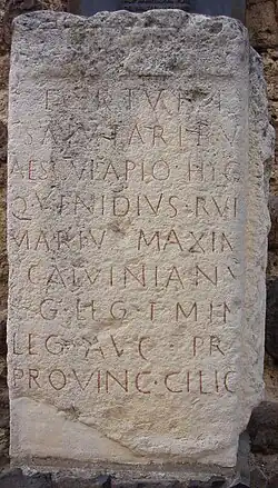 The donor of the stone, Quintus Venidius Rufus Marius Maximus Lucius Calvinianus had served as legatus in the Legio I Minervia and was at the time of the donation legatus pro praetore or governor of Cilicia. He is also mentioned in an inscription from the year 198, with the title Legatus Augusti pro Praetore praeses provinciae Syriae Phoenic[iae] ("Imperial legatus of Praetorian rank protecting the province of Syria Phoenicia").