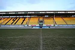 To accommodate increasing interest in the club following good results during the early 1970s, the board approved a new grandstand on the east long side. Construction started in late 1973, with the stand covering two-thirds of the length of the pitch, and opened ahead of the 1974 season with a capacity for 1,056 spectators. The clubhouse was expanded to 200 square meters (2,200 sq ft). In 1974, the club won promotion to the First Division, and the new grandstand was extended by 352 seats. On the west side, two wooden and steel-standing terraces were built. The expansion was done with help of volunteer work, with 30 to 40 people helping each weekday evening and up to 80 people helping at the weekends.[2]