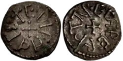 ![]() Silver sceat of Æthelwald Moll, struck 759–765. Coin is a joint issue bearing the names of Æthelwald on the obverse and Archbishop Ecgbert of York on the reverse. | |