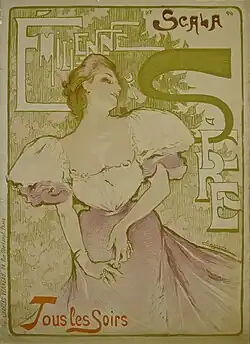 She performed at the Alcazar de Bruxelles[note 1][7] and at the Salone Margherita (Napoli) in Naples[8] in 1899,[9] at the Театр Омона in Moscow in 1900[10] at the Alcazar of Marseille in 1901[11][12] in Roma[13] in Naples[14] at the Kursaal[15] or "Nouveau-Théâtre" in Geneva[16][17] at the Palace Theatre, London in 1902, then in Düsseldorf, Berlin and Vienna[18] and at the Central-Theatre in Leipzig in 1903.[19]