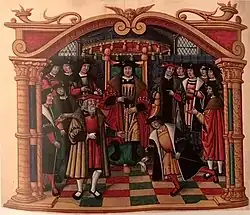 The "Master of the Puys de Rouen" (loosely, "... of the Hills of Rouen") was engaged for several projects by Étienne Colaud, notably on the so-called "Rouen Manuscript", the work for which he was the principal illustrator, and from which he acquires the name by which he is generally known by scholars.[11] He was active in Paris between 1520 and 1540. His style is characterised by exaggeratedly square-jawed figures, firm outlines and voluminous architectural framing. In addition to the works he produced for Colaud, several other significant manuscripts are attributed to him, including an Evangelion for the Duprat family, a Book of Hours which recently appeared on the London art market through a dealer called Sam Fogg,[10] and another Book of Hours sold by the specialist dealer "Les Enluminures" in 2008. The German art historian Eberhard König has suggested this last work might be attributed to Henri Laurer, an artist from Paris who moved to Mirepoix (far away, south of Toulouse) but the attribution was not endorsed by other specialist scholars.[1]