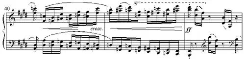 In the middle section (poco più animato), characterized by rhythmic shifts and sudden harmonic turns, theme and accompaniment are fused into oscillating double notes. There are five eight-bar phrases. Leichtentritt observes that each eight-bar phrase is "ruled by a new motif" and that "each of these segments surpasses the preceding one in sonority and brilliancy".[11] The third period, although it stays chromatically centered around E major, is a long sequence of diminished seventh and tritone intervals, littered with accidentals and irregular rhythms difficult to play. It reaches a climax in the fourth period (bars 46–53), a bravura passage of double sixths for both hands. The fifth period (bars 54–61), leading back to the final restatement of the theme, can be described as an extended dominant seventh. Leichtentritt believes it to be "one of the most exquisite sound impressions ever contrived for the piano".[12] Its effect is "based on its contrast with the fourth period and on the gradation of the most tender nuances in piano". The final A section is a quite literal though shortened restatement of the first one. At the end of the étude the fair copy autograph contains the directive attacca il presto con fuoco which means that Chopin foresaw the joint performance of both this étude and the following one.[13]