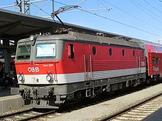 Between 2002 and 2005, all locomotives in the 1044.2 series were converted into to the new 1144.2 series. In 2009, the 1044.0 Class locomotive was also converted to the 1144 series.[10] The 1044.40 largely retained its original livery of blood orange featuring the old ÖBB logo ("Pflatsch") and was coined a "modern nostalgia locomotive", and remained in scheduled service. Before the procurement of the 1016 and 1116 series, all express trains to Munich were hauled by the 1044 series.