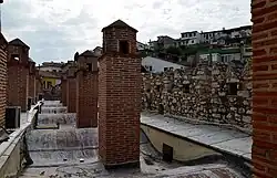 The large courtyard is surrounded by rooms behind arched stoa.[1] The corner rooms are reached by a diagonal passage.[4] There are 28 rooms on ground floor, which have a window next to their door under the stoa facing the courtyard. Entrance to the room is over a step. The fireplace in the room, situated in the wall separating the rooms, is flanked by two small closets.[4]