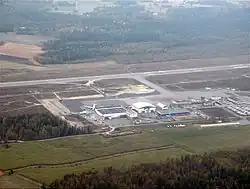 A coach service is operated by Let's Go By Bus Örebro between the airport and Örebro Central, with services timed to coincide with the Ryanair flights to and from London-Stansted on Fridays and Sundays. Tickets can be bought on the bus or on the FlixBus website.[8] The nearest public bus stop, (about 2 km away) has services to and from the centre of Örebro. It is served by bus 620 on weekdays and bus 600 at weekends.[9] Other transport alternatives will likely involve a car or taxi. Most flights are tourist charter which attracts child families who mostly use their car for transport. There are many parking spaces, which have a fee.