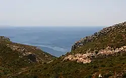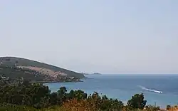 The town reaches approximately 100 m (330 ft) at its highest elevation,[19] with mountainous terrain surrounding it to the north within the peninsula. This is a result of Turkey's fault block features – the convergence of the Anatolian Plate against that of the Aegean Sea Plate – and the wide range of mountains in western Turkey and the Aegean Region surrounding the Büyük Menderes River to the south, collectively referred to as the Menderes Massif.[20]