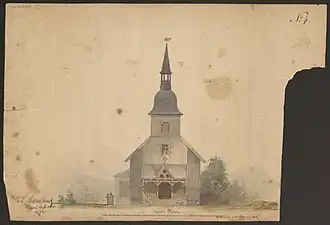 The earliest existing historical records of the church date back to 1385, but the church wasn't new at that time. The first church was a wooden stave church that was likely built during the 12th century. The original church was located about 50 metres (160 ft) west of the present-day church site. The original floor plan was that it was a rectangular long church design with a narrower chancel, very similar to the Kvernes Stave Church. Probably during the 1500s or 1600s, the church was enlarged by building transepts to the north and south of the nave, creating a cruciform floor plan. The additions were all built using stave church construction. After this renovation, the church nave measured about 20 by 9 metres (66 ft × 30 ft) and the church porch on the west end measured 4.3 by 4.3 metres (14 ft × 14 ft). In 1665, the roof was severely damaged due to a lightning strike and a new roof was built. In 1699, the old, medieval church was renovated and refurbished.[3][4]