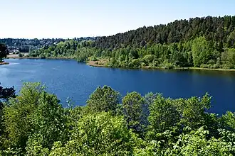 Situated inside the Oslo city limits, surrounded on all sides by built-up areas, has put a considerable strain on the lake, both in terms of pollution (especially caused by leaks from less-than-perfectly maintained sewage systems) and plans for using the fields and forested areas surrounding the lake for various purposes, including housing, a cemetery and even a small golf course. The sewage systems affecting the lake have been better maintained in recent years, and the environmental state of the lake is currently much better than it was a decade or two ago. [6]