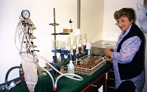 Þórunn Þórðardóttir performing an experiment on algae aboard Bjarni Sæmundsson HF 30