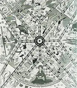 The Swedish Didriks Krönika inspired at least two pictorial depictions. Around 1480, artist Albertus Pictor included the scene of Didrik's fight with Wideke and the latter's flight into the sea was included, along with the battles of several other biblical and legendary heroes, on the roof of Floda church in Södermanland, Sweden.[76][77] An illumination in a law codex from Uppland from the mid 15th century also shows a scene from the saga: it shows the knight Sistram, identified by text, half-swallowed in the jaws of a dragon.[78]
