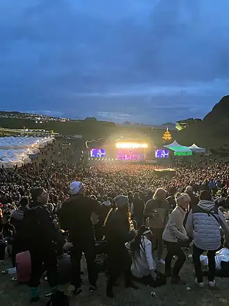 In 2011, a permanent main stage was constructed, replacing previous temporary structures. The Herjólfsdalur valley forms a natural amphitheatre for guests, where the main stage is located. A pond is located behind the main stage, adjacent to smaller stages and amenities and sales stands. On the east side of the valley, there are the 'White tents', where locals invite family, friends and the general public to their hospitality.[6]