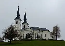 The local parish church is dedicated to Saint Michael and belongs to the Roman Catholic Diocese of Novo Mesto. It was first mentioned in written documents dating to 1526 and was expanded in the 19th century. The place is also known for its pilgrimage church dedicated to the Assumption of Mary, built in the hamlet of Zaplaz on a hill north of the settlement. It is a Neo-Renaissance building with two spires, built between 1906 and 1926 on the site of an earlier church from 1848.[5]