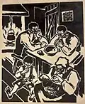 While an apprentice in his father workshop, Đorde liked to socialise with the workers, and he subsequently joined the Association of Graphic Workers.[9] In 1923 he painted a poster for the International Workers' Day celebration, which was printed and put up around the city and in streetcars. Kun's interest in left-wing ideas and communism most likely arose during his stay in Paris, where he received books on Lenin and the Soviet Union from friends. Through his wife Nada he began to associate with communists and members of the then illegal Communist Party of Yugoslavia (KPJ). Left-wing ideas did not affect his artistic expression prior to 1934. The conference of the International Association of Revolutionary Writers, held in 1930 in Kharkiv, and the First Congress of Soviet Writers, held in August 1934 in Moscow, defined the concept of socialist realism, an artistic style with the aim of spreading communist and socialist ideas, which highly influenced Kun's artistic output from that point onwards.[1][7]