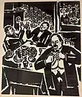 After returning to Belgrade, he created a set of graphics titled Blood-soaked Gold (Krvavo zlato) with the aim of displaying the lives of Yugoslav miners and workers. Although the collection was finished, he was unable to find a printer in Belgrade who would print his work. He printed 10 copies of the collection in his studio in 1936. With the help of architecture student Voja Midić, he reached printer Jovan Luks from Stari Bečej, who agreed to print the collection.[12] In January 1937, the first 250 copies were printed, and soon after, a second edition of 1,000 copies was published, which the writer Jovan Popović wrote the foreword for. The map of graphics depicting the difficult daily life of miners and arduous work, as well as the dissolute life of profiteers, was banned by the Belgrade City Administration in February of 1937.[1][13]