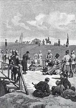 Peace negotiations between the ambassador of Khan Ğazı Giray and prince Khvorostinin on a bridge over the Sosna river in 1593.