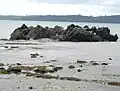 The layered sandstones and siltstones (mudstones) are seen in the cliff faces and also form the shore platform around the north and west sides of the park. These softer, generally yellow-brown rocks are approximately 19-20 million years old and are made up of the Waitamata formation (East Coast Bays facies) of early Miocene (Late Otaian) age.[7] Distortion and faulted dipping, of this once soft strata, can be seen both in the cliffs and in the small ridges of the rock platform extending out from the beach at low tide.