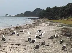 At least twenty-six different types of bird are found in the park. natives include: pied stilt, pūkeko (Porphyrio melanotus), kererū, tūī which appears almost black except for a white tuft under its chin, fantail, grey warbler, red-billed gull, southern black-backed gull (see kelp gull), South Island pied oystercatcher and the closely related variable oystercatcher (Haematopus unicolor), pied shag, kingfisher, and white-faced heron.[5] The white-fronted tern can be found resting on the greywacke outcrops which become visible at low tide.