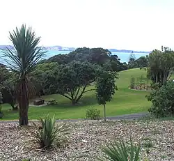 The park is located on a gently contoured knoll, which rises 40 meters above sea level. From the highest point looking inland, visitors can see from Maraetai to the Beachlands settlements. Looking seaward, there are views of the Hauraki Gulf.[2]