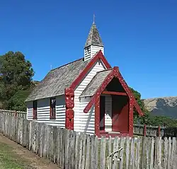 The foundation stone for a non-denominational church – the first in New Zealand – was laid at Ōnuku in 1876,[11] and the church opened in 1878.[16] Intended as a place of worship for both Māori and Pākehā, the opening of the whare karakia was attended by Māori from all over the country.[2] Built out of timber with a pitched shingle roof, it has a bell turret and room for 60 parishioners. The church was restored and traditional carved panels were added to the porch in 1939 for a centenary of Akaroa service in 1940, an event attended by over 1000. Services were held regularly until 1963.[2][17] In 1976 a new fence was built, and a poupou Tumiki, carved by Pere Tainui and gifted by Te Wai Pounamu Old Girls Association, was erected beside the church.[2] The church is listed as a Category 1 Historic Place by Heritage New Zealand.[1]