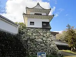 During the Meiji era (1868–1912), abandoned and left at the mercy of the elements, the castle deteriorated rapidly. After 20 years of neglect, in 1888, the main keep was on the verge of collapse and was thus demolished. Nonetheless, its two surrounding turrets (櫓, yagura), Koran and Daidokoro, were left intact. These turrets, built in the late Edo period (1603–1868), as well as the turrets named Owata and Minami Sumi were marked as Important Cultural Property in 1957 by the Agency for Cultural Affairs of the Japanese Government.[2]