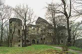 Świny Castle (Polish: Zamek Świny; formerly Schweinhausburg in German) - formerly a gord, as a stronghold existed in its location already in the fifth century - securing the Lubawecki mountain pass, the site was recorded in Cosmas' documents from 1108, where the gord is recorded as Suini in Poloniae.[1] Possibly, soon after, the gord had been expanded into a military stronghold, at which time it was the seat of the castellans. The castle was mentioned in Pope Adrian IV's Papal bull.[2]