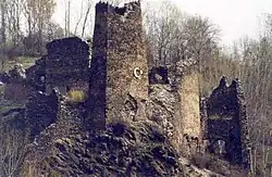 Much of the castle wall is still standing, as well as the castle dungeons, and the remains of a church on the northern side.[2] The castle's main feature is its "strange trapezoidal towers".[4]