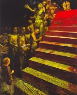 Šarūnas' work, by both critics and laymen, is often referred to as "different". However, the "difference" in Sauka's paintings is quite consistent. Sauka's imagery is rich with religious symbolism, sharp contrasts of colour, characters and objects in a state of decay. The images of blood, organs, severed body parts and butchery are often found in his paintings. This literal dissection or deformation of the human form is possibly an expression of the author's belief that the human must be stripped from conventional chains in order to contemplate the true condition of its body and soul. In many of his paintings, he uses his own face, sometimes faces of his family members or relatives; the victim and aggressor usually both have the same face.[1] A full appreciation of his artwork requires an understanding of the extent and cruelty of the communist terror in Lithuania and other countries of Eastern Europe and a grasp of some of the underlying metaphysical and archetypal ideas that are basic to his world view and sensibility.[2]