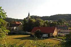 The Vrh Estate (in older sources also Kolešnik,[2] German: Auenthal[2]) stands 1 km west of Škocjan. By the 20th century it was reduced to a large farm owned by the Rupar family of Goriška Vas pri Škocjanu.[5] The manor was built before 1667 by Wolfgang Blande. It passed through many owners over the following centuries and was purchased by the Rupar family in 1928.[6]