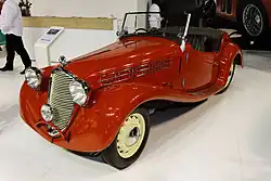 In 1938 Škoda launched a streamlined version of the 1,558 cc Rapid OHV with a new aerodynamic two-door saloon body.[9] It bears a strong resemblance to the streamlined four-door body that Škoda built for its Type 935 prototypes in 1935–38.[10]