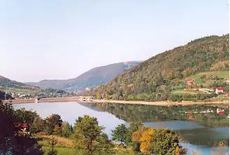 Żywiec Lake (Polish: Jezioro Żywieckie) is a reservoir on the Soła river in southern Poland, near the town of Żywiec. It was created in 1966, when several villages in the area, such as Zarzecze, Tresna, Zadziel and Old Żywiec were flooded following the construction of a dam. The lake has the area of around 10 square kilometres, and the earth-filled dam is 39 metres high and 310 metres long. The maximum depth of the lake is 26.8 metres (88 ft), and the average depth is 8.6 metres (28 ft). Near the dam there is a hydro-electric power plant with the capacity of 21 megawatts (28,000 hp). Żywiec Lake is used mostly for tourist purposes, to regulate the flow of water, and to protect the area from flooding.