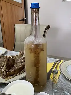 A bottle of home-produced Țuică in Sighetu Marmației served alongside other Easter feasts. Noted an interlocking wooden stick inside of the bottle, typical of Maramureș region