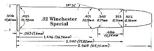 The .32 Winchester Special / 8.2x51mmR (or .32 WS) is a rimmed cartridge created in October 1898 for use in the Winchester Model 94 lever-action rifle.[3] It is similar in name but unrelated to the .32-20 Winchester cartridge (which is also known as .32 WCF).