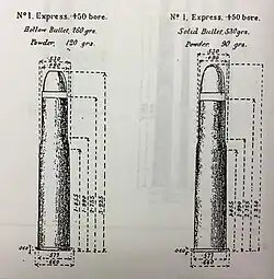 The .500/450 No. 1 Nitro for Black was the same cartridge loaded with mild loadings of cordite, carefully balanced to replicate the ballistics of the black powder version. Unlike other similar black powder cartridges, such as the .450 Black Powder Express and .500/450 Magnum Black Powder Express, the .500/450 No. 1 Express never became a Nitro Express cartridge.[2]