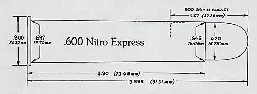 The .600 Nitro Express is a slightly tapered walled, rimmed, centerfire rifle cartridge designed for use in single-shot and double rifles.[4]