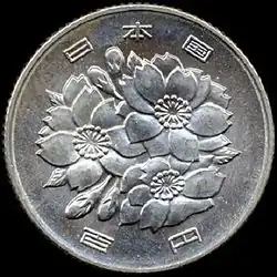 The 100 yen coin (百円硬貨, Hyaku-en kōka) is a denomination of Japanese yen. These coins were first minted in 1957 using a silver alloy, before the current design was adopted with an alloy change in 1967.[1] It is the second-highest denomination coin in Japan, after the 500 yen coin. The current 100 yen coin is one of two denominations that depict the emperor's rule date in Arabic numerals rather than kanji.
