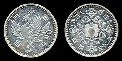 100 yen coinage was first authorized in 1951 with the specification that the coins be made of a silver alloy.[2] These were first minted for circulation in 1957 and feature a phoenix on the reverse. The alloy decided upon consisted of 60% silver, 30% copper, and 10% zinc and came at a time when banknotes of the same denomination were already in circulation.[3] The "100 yen" bill hence became a substitute to the coin as the two were allowed to co-circulate.[4] The design of the coin was later changed in 1959 which removed Latin script ("Yen") and changed the reverse side to show a sheaf of rice. To commemorate the summer 1964 Olympics in Tokyo 16 million ounces of silver was used to strike the 80,000,000 coins produced. None of these coins were recorded as ever going into circulation as they were grabbed and stored away as collectors items.[4] Minting 100 yen coins was profitable up into the mid-1960s until the worldwide price for silver bullion began to rise. The Japanese government had planned on producing 800 million silver coins over a 10-year span,[a] but the amount of silver held was insufficient.[5] Silver was dropped from the coinage in 1967, which led to coin hoarding and silver smuggling outside of the country for melting.[6]