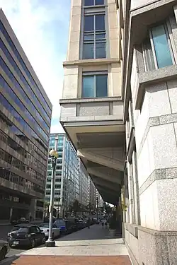 The Raleigh Hotel closed in 1954, and by 1965 developer Jerry Wolman had purchased the site and proposed building the current structure.[5] It was one of the first structures built under the Pennsylvania Avenue redevelopment plan approved in 1964,[6] and the first private building to be built.[7] Because of restrictions imposed by the Pennsylvania Avenue National Historic Site legislation, Wolman agreed to move the building line back from Pennsylvania Avenue by 50 feet (15 m) and keep the building's height to 135 feet (41 m), although in exchange for the loss of interior square footage District of Columbia zoning officials gave him permission to cantilever the building over the sidewalk on 12th Street at a height about 30 feet (9.1 m) above the street.[5][8] Named the Presidential Building (or the Presidential Office Building), the structure was designed by Edmund W. Dreyfuss & Associates in the Brutalist style.[6][9] Dreyfuss worked closely on the building with John Woodbridge, a staff architect for the President's Council on Pennsylvania Avenue and a member of the firm Skidmore, Owings and Merrill.[7] The President's Council chairman was Nathaniel A. Owings, a partner in that firm.[7] The building was completed in mid-1968,[1][2] and originally had 253,000 square feet (23,500 m2) of interior space.[6] Its address at this time was 415 12th Street NW.[6] The District of Columbia Public Schools leased seven of the floors in the building,[2] with other District government offices renting the remaining space.[6]