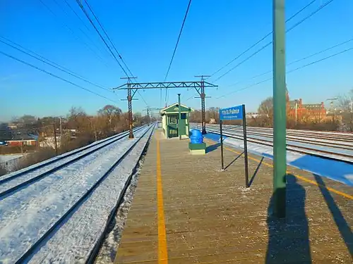 111th Street (Pullman) is a commuter rail station on Metra Electric's main branch in the Pullman neighborhood on the far south side of Chicago, Illinois. It is located at 111th Street and Cottage Grove Avenue, and is 14.0 miles (22.5 km) away from the northern terminus at Millennium Station.[2] In Metra's zone-based fare system, 111th Street (Pullman) is in zone 2. As of 2018, the station is the 219th busiest of Metra's 236 non-downtown stations, with an average of 31 weekday boardings.[1]
