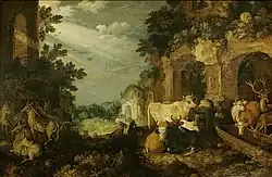Landscape with ruins, cattle and deer