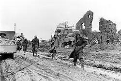 The regiment was briefly organized as a motorized infantry regiment before reverting to traditional infantry organization prior to shipping overseas. The 121st Infantry subsequently saw combat with the 8th Infantry Division in the European Theater of Operations during 1944–45. The regiment returned from World War II at the Boston port of entry on 11 July 1945 and then moved to Fort Leonard Wood, Missouri, where it was inactivated on 20 October 1945.[3] In September 1946, the 121st Infantry Regiment was assigned to the 48th Infantry Division, a national guard division headquartered in Jacksonville, Florida. In 1955, this division became the 48th Armored Division and moved its headquarters to Macon, Georgia. As a result of this reorganization, the 121st Infantry Regiment ceased to exist as a tactical organization. Some elements of the 121st Infantry were transferred to the 162nd Tank Battalion in May 1956.[4][5] As the army adopted the Pentomic structure in the late 1950s, infantry regiments were broken up and the component battalions reassigned to brigade headquarters while still retaining the number of their former regiment in their titles. Thus, while the 121st Infantry has not existed as a separate tactical organization since the mid-1950s, some Georgia National Guard battalions, such as 2nd Battalion, 121st Infantry Regiment are still affiliated with the regiment, but assigned to brigades such as the 48th Infantry Brigade for purposes of tactical organization.