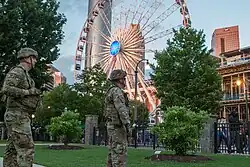 Members of the 3rd Battalion, 121st Infantry Regiment, monitor protesters in Atlanta during May 2020