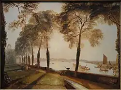 Turner's two paintings were made for William Moffatt,[1][6] whose house it then was. Mortlake Terrace: Early Summer Morning (1826) is in the Frick Collection, New York.[1][3] It was shown in the Royal Academy exhibition of 1826 where it was praised for its "lightness and simplicity".[1] Mortlake Terrace (1827) is in the National Gallery of Art, Washington D.C.[1][6]