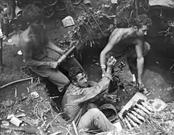 The 132nd next fought in the Bougainville campaign. It arrived at Cape Torokina on 9 January 1944, and relieved the 3rd Marine Parachute Battalion, the 3rd Marine Raider Battalion, and units of the 145th Infantry, which then reverted to the 37th Division. The 132nd Infantry took over that portion of the perimeter paralleling the Torokina on the extreme right flank and engaged in patrolling and in strengthening defensive positions. On 5 April 1944, after establishing patrols along Empress Augusta Bay, the 132nd successfully launched an attack to capture Mavavia Village. Two days later, while continuing a sweep for enemy forces, the Regiment encountered prepared enemy defenses, where they destroyed some twenty Japanese pillboxes using pole charges and bazookas. Later, the 132nd secured the heights west of Saua River in fierce fighting that lasted until 18 April, when the last of the Japanese defenders were killed or driven off.[5]