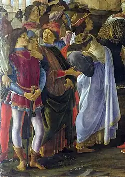 The general European convention of completely covering married women's hair was not accepted in warmer Italy.[26] Italian women wore their hair very long, wound with ribbons or braided, and twisted up into knots of various shapes with the ends hanging free. The hair was then covered with sheer veils or small caps. Toward the 1480s women wore chin-length sections of hair in loose waves or ripples over the ears (a style that would inspire "vintage" hair fashions in the 1620s and '30s and again in the 1840s and 1850s). Blonde hair was considered desirable (by Botticelli for one), and visitors to Venice reported that ladies sat out in the sun on their terraces with their hair spread out around large circular disks worn like hats, attempting to bleach it in the sun. Chemical methods were also used.[b]