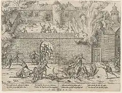 In the first months of the new king's reign raids were organised against Protestant lodgings in Paris. This included assaults into the faubourg (suburb) Saint-Germain, where there was a district known as 'little Genève'.[146] The gentleman who had gathered to worship defended themselves with arms. Further inspections of houses were met by armed Protestants.[147] Various texts were recovered from the raids, containing remonstrances to the king on both religious and political grounds.[148] In particular, one treatise belonging to a noble named La Fredonnière, was noted privately by the procureur du roi (crown prosecutor) as being very well reasoned, even if applied to poor ends. Jouanna postulates it may have been a discussion of legal methods to remove the Guise from power.[149] New laws were established against Protestantism. As early as 25 August, François requested a doctrinal condemnation of certain views on the mass and sacrament from the theological faculty of Paris - which complied several days later.[150] On 4 September an edict established at Villers-Cotterêts declared that houses used for covert Protestant meetings were to be razed. This law would be registered on 23 December, with the parlement being reluctant to register the harsh terms.[151] On 9 November, a new law made those who hosted or attended Protestant meetings liable for the death penalty. According to the edict the meetings not only attacked the mass but also the king.[150] It was obligatory to report such meetings if one was aware of them. This introduced an element of popular involvement to the campaign against Protestantism.[3][146] Informers could enjoy a share of the property confiscated from convicted heretics.[152] The parlements of Aix and Toulouse were particularly rigorous in applying the persecutory edicts.[153]