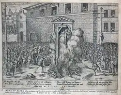 In a famous case on 23 December, the Protestant parlementaire Anne du Bourg was strangled and then burned at the stake.[154][155] The other parlementaires who had been arrested alongside him on grounds of heresy were released after recanting.[156] Their trials were largely softball affairs, their parlementaire colleagues not keen to see any of their number executed, and therefore offering every opportunity for them to exculpate themselves.[157] Du Bourg's execution came despite the pleas of much of the Protestant world in his favour, among them the Kurfürst von der Pfalz (elector of the Palatine) and the duchessa di Savoia (duchess of Savoia) .[147][158][159] One of the parlementaire judges most associated with the ultra-wing of the chamber that had moved for du Bourgs execution, president Minard, was assassinated on 12 December while returning home from the palais de justice by masked gunmen.[157] The gates to Paris were hurriedly closed while the assassination was investigated. A Scotsman named Robert Stuart was arrested but confessed nothing under torture. Du Bourg also denied any knowledge of the plot from prison.[160] The assassination of Minard made the government keener to see the execution of du Bourg through.[161] While there was a prospect of the execution being avoided after he agreed to a carefully worded confession of faith on 13 December, he renounced his signature of the document on 19 December.[157]