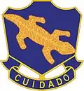 The service of the former and current organization, the 158th Infantry Regiment is indicated by the Gila monster, indigenous to the State of Arizona, which is emblematic of tenacity and security. The color blue represents Infantry. It is also symbolic of loyalty and faith. The motto "CUIDADO" a Spanish word meaning "Take Care" is a caution first used by those serving in the regiment's progenitor, the 1st Arizona Volunteer Infantry.